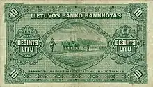 In 1919, Žmuidzinavičius participated in the plans to launch the national currency to replace the ostmark and ostrubel. He created drafts of the new banknotes (called muštinis) and travelled to Sweden to negotiate the printing, but the plans were abandoned.[2][18] Instead, Lithuania introduced the gold-backed Lithuanian litas in 1922. It is very likely that Žmuidzinavičius participated in the design of the first litas banknotes as they bear the coat of arms of Lithuania that is very similar to Žmuidzinavičius' version.[18] In 1927, Lithuania redesigned litas banknotes and Žmuidzinavičius was asked to design the 10 litas banknotes that would depict a Lithuanian village. He based his design on a photo by Antanas Tamošaitis of his brother sowing grain in spring.[18]