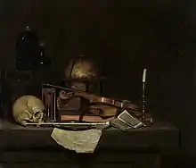 He also painted still lifes, including vanitas still lifes and kitchen pieces.[2] He further possibly painted the staffage in a few views of church and palace interiors by Dirck van Delen and Anthonie de Lorme and in the Great Assembly of the States General in 1651 by Bartholomeus van Bassen.[3]