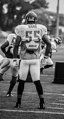 In six games, Barr made more than 7 tackles, including nine against Stanford, eight in the Pac-12 Football Championship game, and nine in the Holiday Bowl against Baylor.[7] Despite being touted as a potential first-round draft choice in the 2013 NFL Draft, Barr decided to return to UCLA for his senior season.[17] On July 8, 2013, Barr was ranked 37th as a possibility for the Maxwell Award and 3rd as a candidate for the Chuck Bednarik Award.[18][19] On July 15, 2013, Barr was named as a candidate for the Butkus Award and the Lombardi Award.[20][21] He was also named to the 2013 preseason All-American team.[22]