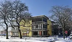 Architects Perkins & Will designed the school in the mid-century modern style, which was chosen as a departure from institutional school buildings. The school was divided into three three-story sections to avoid the dominating impression of a single building; each section included large corner windows shaded by canopies and used colorful yellow brick to stand out from surrounding buildings. The building was added to the National Register of Historic Places on September 6, 2016.[1]