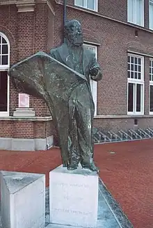 After he retired as a preacher in 1882, he went to live with his daughter in Voorburg, where he died and was interred in 1908. A statue of Winkler Prins was erected outside the Veenkoloniaal Museum ("Peat Colony Museum") in Veendam in 1991; see photo. On 9 September 2005, the Museum had the remains of Winkler Prins and his wife Henderika reburied in the graveyard of the Reformed Church in Veendam.[1]