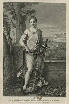 Larcher's engraving titled "Judith standing with her foot on the head of Holofernes" was finished about 1729 and is currently housed at the Metropolitan Museum of Art.[3]