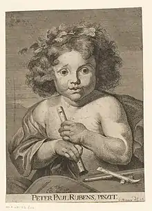 Due to the difficult preparatory work and prolonged publication history of the Theatrum, von Prenner and van Stampart published the Prodromus (full title: Prodromus, seu Praeambulare lumen reserati portentosae magnificentiae theatri, quo omnia ad aulam caesaream in Augustissimae suae caesareae) in Vienna in 1735. It was intended to give a preview of the volumes of the Theatrum that had yet to appear ('prodromus' means a preliminary publication or introductory work). The Prodromus offers an overview of the works already published in the Theatrum and a preview of what the next volumes would offer.[5] It reprises the plans of the galleries with views of six rooms of the Theatrum. These are followed by plates showing the walls of the galleries, completely covered by framed paintings. Each of the 24 plates reproduce 960 paintings by 230 painters with fast strokes. Four pages show 228 sculptures, reliefs, gems and medals in the collection. One of the important improvements in the Prodromus in comparison to the Theatrum is that the paintings are rendered not in mirror view starting from plate 8. This publication enjoyed support in high places as is shown by the fact that prominent aristocrats engraved some of the plates: Count Leopold Windischgraetz (plate 9), the counts Anton and Johann Nepomuk Csáky (plates 11 and 13) and Maria Barbara Lemperg (plate 12).[6]