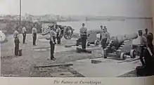 On the outbreak of World War I in August 1914, the North Irish Coast Defences comprised No 15 Company, RGA, at Derry, and the Antrim RGA (SR) at Carrickfergus.[7][29] The Antrim RGA manned two Vickers-Maxim Mk VII 6-inch guns at Grey Point Fort, a new battery built at Helen's Bay on the south shore of Belfast Lough between 1904 and 1907.[30][31][32][33]