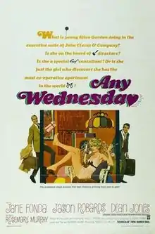 Any Wednesday is a 1966 American Technicolor romantic comedy film starring Jane Fonda, Jason Robards, and Dean Jones. It was directed by Robert Ellis Miller from a screenplay by producer Julius J. Epstein based on the play of the same name by Muriel Resnik, which ran for 984 performances from 1964 to 1966.[3] The film was titled Bachelor Girl Apartment in the UK.[4]
