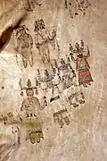 The Gaan dancers chant and keep beat with the same dance step as the girl, while in motion they lead the participant guests about the plaza. Eventually the girl follows the "clown" Gaan around the plaza and the guests fall in line after her. Upon returning to her original position, the Gaan surround the girl. The "clown" holds a mixture of ochre and corn pollen that is sprinkled or brushed over the girl by the other Gaan. Any remaining pollen may be emptied from the basket over her head and body. The Gaan bring a powerful spirituality to the ceremony as the Apache girl is transformed and attains womanhood.[1]