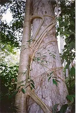 Native elm covered by a Moreton Bay fig and wombat berry vine, growing in a dry rainforest by the Richmond River, Australia