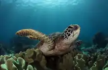 The fish sanctuary, at the southeastern part of the island has been closed "temporarily" since 2011 after it got devastated by typhoon Sendong.[6] This beach is indeed facing the ocean and is now banned from snorkeling and the place is now used to park fishing boats. Though the island is not a marine reserve, only the local population have the right to catch fish. The main advantages on the island is indeed the facilities for diving residing on the island (with tanks and compressors) and the protection of sea turtles where more than 60 are recorded, and an amazing diversity of soft and hard corals. In the north part of the island, currents offer exceptionally clear waters with a school of jacks, 13 barracudas, few groupers located near Coconut diving spot.
