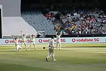 In cricket, an appeal (locally known as a “Howzat”) is the act of a player (or players) on the fielding team asking an umpire for a decision regarding whether a batter is out or not. According to Law 31 of the Laws of Cricket, an umpire may not rule a batter out unless the fielding side appeals for a decision.[1] However, in practice most umpires will give a batter out to an obvious bowled or caught. On many occasions when a batter has otherwise technically been out, the fielding team has not realised, so neglected to appeal, and so the umpire has not declared them out.[2] An appeal may be made at any point before the bowler starts their run-up for the next ball.