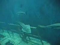 The largest aquarium is called "Fosse Aux Requins". It contains a false shipwreck in polyurethane resin (the iron would have rusted and the rust is toxic to fishes). Its glass is 23 centimetres thick to resist the water pressure.