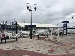 Aquarium ferry wharf (also known as Darling Harbour Aquarium ferry wharf) is a commuter wharf that serves the Darling Harbour precinct as well as the Sea Life Sydney Aquarium, which is right next to the wharf. The wharf, built in the 1980s as part of an initiative to deliver transport services to the then-newly redeveloped Darling Harbour, was originally part of the Sydney Ferries network. The wharf served as the terminus of Darling Harbour ferry services, until the wharf was decommissioned by Sydney Ferries in October 2010, when services to the wharf were rerouted to King Street Wharf 3 instead. My Fast Ferry currently handles services to the wharf, which acts as a terminus for their Manly - Darling Harbour Harbour loop service.