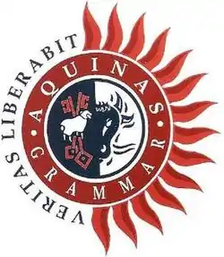 The school's motto is Veritas Liberabit which is Latin for "The truth will set you free". The school crest is a circle half-surrounded by a 'mane' (representing the Evangelist Mark), and inside the circle in one half there is half of an ox (symbolising St Thomas Aquinas) and the symbol of the lamb and the keys.
