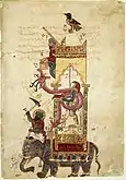 Despite the considerable changes in Arabic miniature style and technique, even during their last decades, the early Umayyad Arab influence could still be noticed. Arabic miniature artists include Ismail al-Jazari, who illustrated his own Book of Knowledge of Ingenious Mechanical Devices,[7] and the Abbasid artist, Yahya Al-Wasiti, who probably lived in Baghdad in the late Abbasid era (12th to 13th-centuries), was one of the pre-eminent exponents of the Baghdad school. In 1236-1237, he is known to have transcribed and illustrated the book, Maqamat (also known as the Assemblies or the Sessions), a series of anecdotes of social satire written by Al-Hariri of Basra.[8] The narrative concerns the travels of a middle-aged man as he uses his charm and eloquence to swindle his way across the Arabic world.[9]