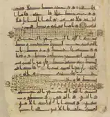 Written in the territory of modern Iraq in the Kufic script. Now kept in the Hast Imam library, in Tashkent, Uzbekistan.[42][43] Its verse endings are marked by small panels of diagonals lines; the tenth verse is marked with a square medallion illuminated in blue, green, red and manganese with a stellar design.[44]