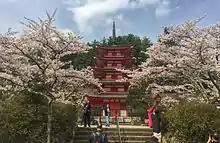 It is a park with a panoramic view of Fujiyoshida city and Mount Fuji, and is famous for its photographs of the five-storied pagoda (a pagoda for the war dead (忠霊塔, Chūrei-tō), not a stupa), cherry blossoms, and Mount Fuji.[1] It was ranked 10th among the "100 Views with Mount Fuji" announced by the Japanese Ministry of the Environment.[6][7][8] It has also been published in Lufthansa's in-flight magazine and textbooks used in Thai compulsory education courses,[9] and became the cover of the 4th revised edition of "Michelin Green Guide Japan", has received two ratings.[10] Fujisan Keizai Shimbun considers that the number of foreign visitors to temples and shrines around Mount Fuji has increased due to this and the influence of Mount Fuji's registration as a World Heritage Site.[11]