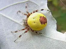 Araneus marmoreus, commonly called the marbled orbweaver, is a species of spider belonging to the family Araneidae. It is sometimes also called the pumpkin spider from the resemblance of the female's inflated abdomen to an orange pumpkin.[2] It has a Holarctic distribution.