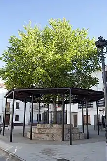 Starry night in Aras de los Olmos - The elm tree in Plaza del Olmo is the meeting point for the town's inhabitants. The current one was planted in 2006, succeeding another specimen that was in the same place for 300 years, and that died from graphiosis. The elm tree in the square has become the emblem of the town, and is used as a logo by various associations and businesses in the municipality. It is very common to find people of all ages resting under its shade, sitting on the heptagonal steps that surround it.