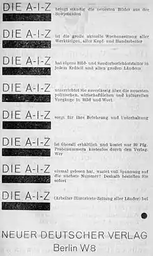 On November 30, 1924, the renamed AIZ appeared with a new format. In 1927 it began publishing on a biweekly schedule, and in 1928 it became a weekly.[2] It became the most widely read socialist pictorial newspaper in Germany. Circulation increased from 250,000 in 1927[3] to 350,000 in 1930.[4] The magazine covered current events and published fiction and poetry, with such contributors as Anna Seghers, Erich Kästner and Kurt Tucholsky. Unlike other labor periodicals it also focused on women's issues and gender relations.[5] Münzenberg wanted the AIZ to connect the Communist Party of Germany to a broad educated readership. In November 1926 AIZ began publishing on a weekly schedule. According to a survey AIZ conducted in 1929, "42 percent of its readers were skilled workers, 33 percent unskilled workers, 10 percent white-collar workers, 5 percent youths, 3.5 percent housewives, 3 percent self-employed, 2 percent independent, and 1 percent civil servants."[6]
