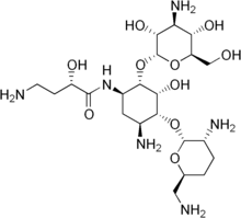 - ↑ Kondo S, Iinuma K, Yamamoto H, Maeda K, Umezawa H (July 1973). "Letter: Syntheses of 1-n-(S)-4-amino-2-hydroxybutyryl)-kanamycin B and -3', 4'-dideoxykanamycin B active against kanamycin-resistant bacteria". The Journal of Antibiotics. 26 (7): 412–415. doi:10.7164/antibiotics.26.412. PMID 4782059.