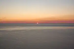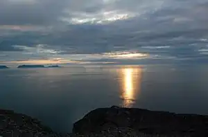 On the way to Arctic View, one drives through a wind farm that was built by Norsk Hydro. Here, at the edge of the Barents Sea, there is a view of the western part of Finmark county, and the place is a popular spot to watch the midnight sun, which can be seen from May 14 to July 31. The sun reaches its lowest point at 12:14–12:24 a.m. The most famous and popular place to view the midnight sun, North Cape, is located about 50 kilometres (31 mi) to the northeast.