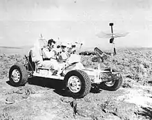 Apollo 16 astronauts train in the Lunar rover by driving over a near-lunar landscape at the Schooner crater site in Area 20