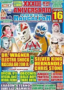 The Arena Naucalpan 33rd Anniversary Show was an annual professional wrestling major event produced by Mexican professional wrestling promotion International Wrestling Revolution Group (IWRG), which took place on December 16, 2010 in Arena Naucalpan, Naucalpan, State of Mexico, Mexico. The show celebrated the 34th Anniversary of the construction of Arena Naucalpann, IWRG's main venue, in December 1977. From 1977 until 1996 the arena was affiliated with various promotions such as Universal Wrestling Association (UWA) and Consejo Mundial de Lucha Libre (CMLL) but in 1996 arena owner and wrestling promoter Adolfo Moreno created his own promotion, IWRG.
