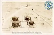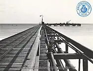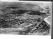 A prominent coastal point, located approximately 2 kilometres (1.2 mi) west of the Taratata Shipyard, was chosen as the site for constructing an oil pier for the refinery. In early 1928, after completing the pier and the necessary pipeline system, the first shipment of crude oil from Venezuela arrived here for storage in the tanks of Arend Petroleum Company. These tanks had also been constructed further inland. The oil pier mentioned was a steel structure that extends 400 meters into the open sea in an "F" shape. It was specifically designed to handle two large ocean tankers for transporting processed oil products, as well as two small tanker ships called lake tankers for importing crude oil from Venezuela. This configuration allows for simultaneous loading and unloading operations to take place.[3] At first, the construction personnel stayed in temporary sheds and tents on Druifbaai Beach while building the pier and refinery. As the company's residential houses were completed in the initial months, they relocated to the Eagle village situated between the factory site and Oranjestad.