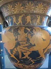 The Arezzo 1465 vase is an Attic volute krater attributed to Euphronios, that dates to the Late Archaic period (550–510 BCE). It is a red-figure style vase, which became popular during the time of its making, and it was found in Arezzo, Italy in the Etruria region in 1465 due to the vast trade network stemming from Athens.[1] The vase is currently housed in Arezzo, in the Museo Archeologico Nazionale.[2]