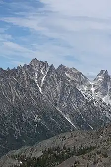 Argonaut Peak is a tall mountain in the Cascade Range in the U.S. state of Washington. Part of the Stuart Range part of the Wenatchee subrange of the Cascades, it is within the Alpine Lakes Wilderness of the Wenatchee National Forest and part of the region known as The Enchantments. At 8,453 feet (2,576 m) in elevation it is the 65th highest peak in Washington.[1] Located on the crest between Colchuck Peak and Sherpa Peak, Argonaut Peak has a southeast and a west summit of almost identical height, with the west being the true summit. There is a prominent southeast spire. Its southern side slopes down to the valley of Ingalls Creek. The north and northeast sides of Argonaut stand high above a branch of Mountaineer Creek, a tributary of Icicle Creek.[3] Argonaut Peak is 1.7 miles (2.7 km) west of Isolation Lake and 1.8 miles (2.9 km) east of Mount Stuart.[2]