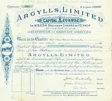 Share of the Argylls Ltd., issued 22. April 1909