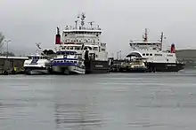MV Argyll Flyer and Caledonian MacBrayne car ferry MV Coruisk on standby at Gourock Pier in February 2017 while Gourock–Dunoon sailings were suspended due to adverse weather.