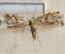 The wingspan is 11–13 mm (0.43–0.51 in).The head and thorax are whitish. Forewings are shining whitish, on costal half strigulated with light golden-brown ; a transverse dorsal mark at 1/3, an outwardly oblique streak from middle of dorsum, and an indistinct tornal mark golden-brown. Hindwings are grey.[2]