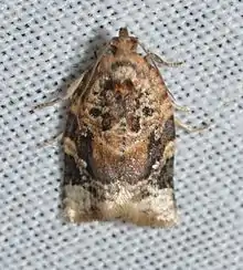 The wingspan is 13–20 millimetres (1234 in). The forewings have a wide diagonal median band that is reddish in females and blackish in males. The basal area is light yellowish-brown with darker shading near the inner margin. The hindwings are dirty white to light grey with a pale fringe. Adults are on wing from February to October in two to four generations per year.