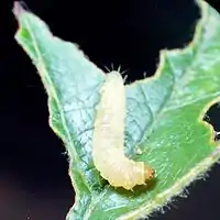 Neonatal larvae are not thought to naturally commit egg cannibalism. However Rock 1968 was able to induce it in laboratory conditions.[4] They go on to feed on various plants, including the leaves and fruit of apple and other fruit trees, as well as spruce and various vegetables. Larvae are green with a pale dorsal stripe and a yellowish head and reach a length of about 16 millimetres (58 in). The species overwinters in the pupal stage in folded leaves on the ground.