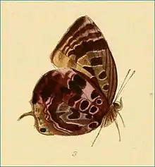 Resembles Arhopala meander but in this species the ground-colour is densely darkened and flows across the upper part of the postmedian transverse band, so that the contours of the latter are entirely effaced and the whole under surface is of a bright red-brown tint.