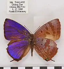 Arhopala agaba, the purple-glazed oakblue, (sometimes placed in Amblypodia)[1] is a small butterfly found from India to Thailand, Langkawi, Indochina, Peninsular Malaysia to the Philippines and Sumatra that belongs to the lycaenids or blues family. The species was first described by William Chapman Hewitson in 1862.