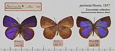 A. perimuta has been established as the type of a separate genus: Darasana Moore (1884),recognizable by the margin of the wings being on all sides rounded, whereby the tailless hindwing appears almost exactly oviform; only the apex of the forewing forms a slight point. Upper surface of male glaringly sky-blue with a black margin of about 1 mm width, under surface violettish-brown with dark, curved, almost parallel transverse lines.[2]