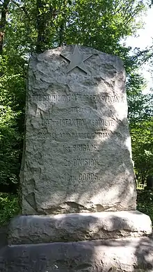 Pardee next saw combat in the Battle of Chancellorsville, where he led the regiment in the brigade of Col. Charles Candy in the Second Division of BG John White Geary, his former regimental commander. He retained command at the Battle of Gettysburg, during which he was engaged in the fighting on Culp's Hill on July 2, and July 3, 1863. A field on Culp’s Hill has been named for him, as a sign painted on a stone shows.[10] The 147th Pennsylvania faced that field during the fighting on July 3, as XII Corps tried to win back ground lost to the Confederate troops of Lt. Gen. Richard S. Ewell on the day before. (Geary was ordered away by Gen Meade with two brigades on July 2, to assist in the battle on the left flank. Instead of going to reinforce the army's endangered left as intended, Geary mistakenly took Candy's command and Thomas L. Kane's brigade out of the battle for the rest of the day.) Their foes resumed the previous day's efforts to carry Culp’s Hill by attacking up hill.[11] Pardee was told by Geary to maintain a steady volume of fire on the Confederates. This aided the repulse of the last attack of BG George H. Steuart's brigade across the field. The volume of fire, however, was such that ammunition became scarce. By 11:00 AM the Confederate attacks ended. The report of Col Charles Candy that Pardee's regiment advanced to the wall on the opposite side of the contested field is not supported by other accounts by credible witnesses.[12]
