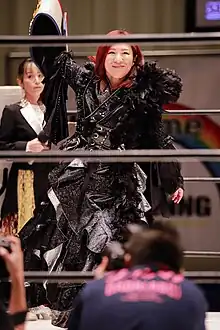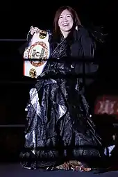 In August, Nakajima became one of the key members of the JWP Seikigun ("regular army"), during the promotion's storyline rivalry with Emi Sakura and Kaori Yoneyama, representing the Gatoh Move Pro Wrestling promotion.[55] After being defeated by Sakura in a singles match August 12,[56] Nakajima and fellow Seikigun member Command Bolshoi defeated Sakura and Yoneyama on August 19 to win the JWP Tag Team and Daily Sports Women's Tag Team Championships.[57] Nakajima and Bolshoi made their first successful title defense on September 9, defeating Leon and Ray.[58] On October 7, the JWP Seikigun, represented by Nakajima, Bolshoi, Kayoko Haruyama and Manami Katsu, were defeated in an eight-woman captain's fall elimination tag team main event by Emi Sakura's and Kaori Yoneyama's new Heart Move Kei Reform (HMK) stable, which in addition to the two also included Hanako Nakamori and Morii. Nakajima was the only JWP representative not eliminated from the match.[59] On October 28, Nakajima and Bolshoi successfully defended their titles against Nakamori and Morii.[60][61] Following the main event, where HMK member Emi Sakura captured the JWP Openweight Championship from Kayoko Haruyama, Nakajima entered the ring and made a challenge for the title.[62][63] On November 11, Nakajima defeated Morii and Nakamori in a four-woman tournament to become the number one contender to the JWP Openweight Championship.[64][65] En route to the title match, Nakajima was pinned for the win by Kaori Yoneyama in an eight-woman captain's fall elimination tag team main event between JWP and HMK on December 2.[66][67] On December 24, Nakajima capped off her return year by defeating Emi Sakura to win the JWP Openweight Championship for the first time.[68][69] Afterwards, the bloody champion, thirteen years younger than her opponent and the second youngest JWP Openweight Champion in history, announced that she wanted to defend the title against wrestlers from her own generation.[70][71] Three days later, Nakajima was named JWP's MVP of 2012, while her and Bolshoi's tag team title match with Sakura and Yoneyama from August 19 was named the Match of the Year.[72]
