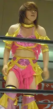 While still affiliated with AtoZ, Nakajima made her debut for JWP Joshi Puroresu on April 30, 2006, when she faced Kaori Yoneyama in a losing effort.[12] Following the folding of AtoZ, Nakajima began working regularly for JWP, starting on May 21.[13] However, she was still officially without a home promotion, working freelancer for various promotions, often teaming with fellow AtoZ alum Sachie Abe as the tag team "Hysteric Babe".[14][15] In JWP, Hysteric Babe teamed only once, on July 16, when they were defeated by Ran Yu-Yu and Toshie Uematsu in a match to determine the number one contenders to the JWP Tag Team Championship.[16] In August, Nakajima made several appearances for the new Ice Ribbon promotion.[17][18][19] During a JWP event on August 6, both Nakajima and Abe announced that they had signed with the promotion, becoming full-fledged members of its roster, with Nakajima becoming the first JWP wrestler born in the Heisei period.[14][15] Afterwards, Abe left Nakajima to reform her old JDStar tag team "The☆Wanted!?" with Kazuki.[15] After a series of losses, Nakajima finally picked up her first JWP win on September 3, when she defeated Yuri Urai.[20] On November 26, Nakajima entered a tournament for the vacant JWP Junior Championship, defeating Hanako Kobayashi in her first round match.[21] The tournament continued on December 12, when Nakajima defeated Hiroyo Matsumoto in her semifinal match.[22] Finally, on Christmas Eve, Nakajima defeated Ice Ribbon representative Aoi Kizuki in the finals to become the new JWP Junior Champion.[23] JWP's year ended with the promotion naming Nakajima the 2006 Newcomer of the Year.[24] Before the end of the year, Nakajima made her first successful defense of her newly won title, when she defeated Mai Ichii at a NEO Japan Ladies Pro Wrestling event on December 31.[25]