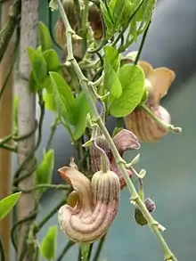 The plant produces large, green-to-pale-brown, curving pipe-shaped flowers, with purple veins and a yellow-to-red lining.[5] The U-shaped flowers produce winged capsular green fruits.[5]