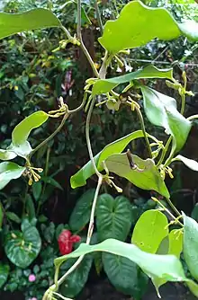 Aristolochia indica (native language: Garudakkodi / Eswaramooli) is a creeper plant found in Southern India and also Sri Lanka. It Is known as 'sapsada' in Sri Lanka and is critical to the survival of the southern birdwing and common birdwing,[1] as well as crimson and common rose butterflies. It reaches a height of several metres on trees and cover the branches with thick foliage. It is commonly found in forest floor, rocky hillslopes. It flowers once a year to produce seeds. It can also be propagated by roots. The plant has a number of historical medicinal uses.