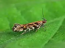 The wingspan is 9–13 mm.[2] The forewings are dark fuscous; a dorsal streak to beyond middle, and sometimes a posterior spot in disc reddish ochreous ; a spot on dorsum at base, an oblique fascia at 1/4 , a costally furcate fascia in middle, a tornal spot, a costal spot beyond it, and some terminal dots rosy silvery; stigmata sometimes obscurely blackish. Hindwings are grey. The larva is ochreous-brown, rosy-tinged ; subdorsal line dark brown, partly edged with pale yellowish ; spiracular pale yellowish, slender ; head and front of 2 pale brown.[3]