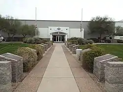 The museum is situated inside an old World War II hangar built in 1941. In front of the museum's entrance is one of four propellers which were once installed on a B-29 Super Fortress.[3] Also on display on the front lawn of the building is a 3-inch Mark 33 deck gun. The deck gun was originally mounted on the USS Guam for aircraft defense. It had the ability to fire 50 rounds a minute. There is a "Walk of Honor" located in front of the museum. The Walk of Honor is a tribute which recognizes the contributions made by Arizonans to the field of military aviation. Inductees are honored for their achievement with the installation of a special bronze plaque at the Museum.[1][2][4]