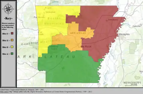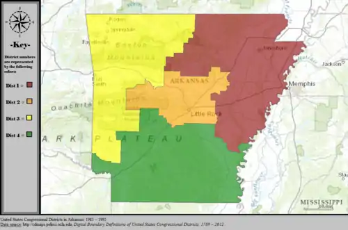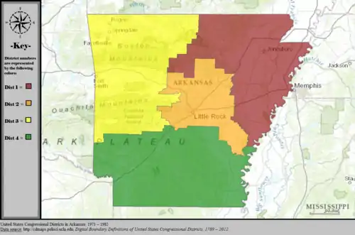 Table of United States congressional district boundary maps in the State of Arkansas, presented chronologically.[3] All redistricting events that took place in Arkansas between 1973 and 2013 are shown.