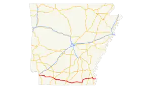 State Road 2 (AR 2, Ark. 2, and Hwy. 2) is a former east–west state highway in the Arkansas Timberlands and Lower Arkansas Delta. The route was approximately 195 miles (314 km), and ran from US Route 67 (US 67) in Texarkana east to cross the Mississippi River near Lake Village, continuing as Mississippi Highway 10.[1] On July 1, 1931, the route was entirely replaced by US Highway 82 (US 82) by the American Association of State Highway Officials (AASHTO). The route was maintained by the Arkansas Highway Department (AHD), now known as the Arkansas Department of Transportation (ArDOT).
