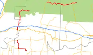 Highway 215 (AR 215, Ark. 215, and Hwy. 215) is a designation for three north–south state highways in northwest Arkansas. A southern route of 8.80 miles (14.16 km) runs north from Franklin County Road 31 and Franklin County Road 221 (CR 31/CR 221) at Dahoma to Highway 96 near the Arkansas River.[2] A second route of 15.94 miles (25.65 km) begins at US Route 64/Highway 917 (US 64/AR 917) in Mulberry and runs north to CR 77/CR 102 in the Ozark National Forest.[3] A third segment of 16.44 miles (26.46 km) begins at Highway 23 at Cass and runs north to Johnson CR 36 at Oark.[4]