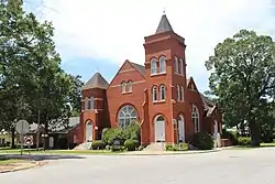 The Arlington United Methodist Church is the only Methodist church in Arlington, Georgia. The church congregation was founded in 1873 and met in a small schoolhouse, then built a white wooden church in 1876. The present church was built in 1908 and was known as Arlington Methodist Episcopal Church, South. It is Romanesque Revival in style and was designed by architect T. Firth Lockwood, Sr. It is built of red brick and has two towers of different heights.[2]