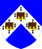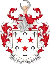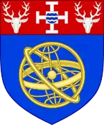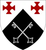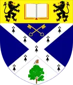 Escutcheon: Barry wavy of six argent and azure, a cross moline gules; on a chief of the last an open book proper clasped Or inscribed with the words 'Quaerenti Ostium', in Roman characters sable between two domed towers also proper, that to the dexter ensigned with an increscent of the first and that to the sinister with an estoile, also Or.