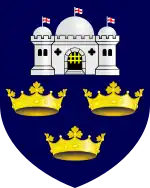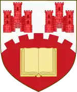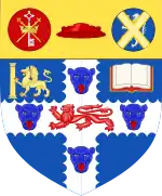 The university's coat of arms incorporates those of the founders and locations of the two colleges it is derived from. In the top left quadrant are the arms of the burgh of Old Aberdeen, with the addition of a symbol of knowledge being handed down from above. Top right are those of George Keith, the fifth Earl Marischal. Bottom left are those of Bishop William Elphinstone.[17] The bottom right quarter is a simplified version of the three castles which represent the city of Aberdeen[18] (this symbol of the city also appears prominently on the arms of The Robert Gordon University).